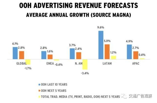 MAGNA预计未来五年(2019-2023)的OOH广告收入(+ 2.8%)将再次超过全球增长率,而传统媒体广告总体下降1.7%。
