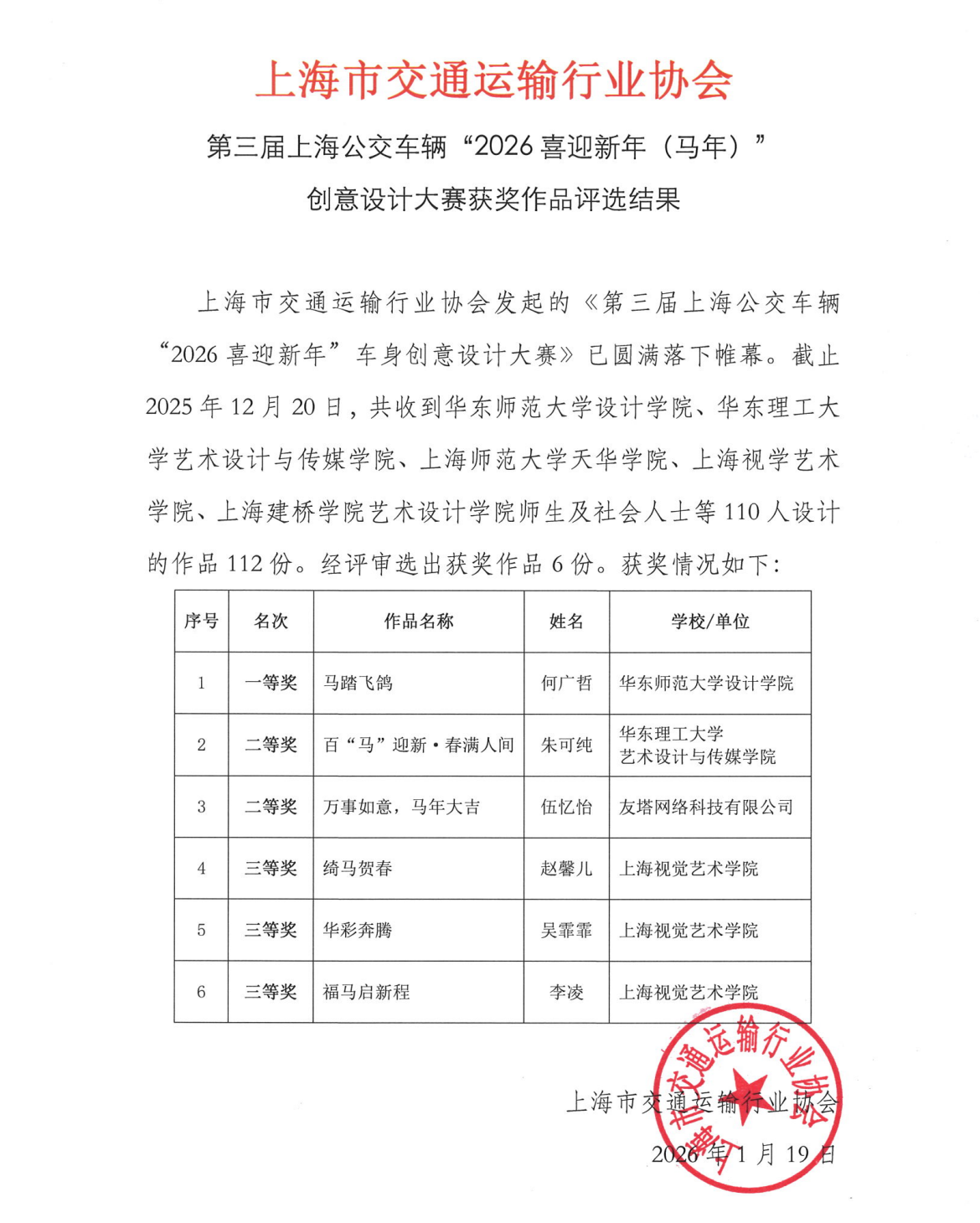 第三届上海公交车辆“2026喜迎新年(马年)创意设计大赛获奖作品评选结果