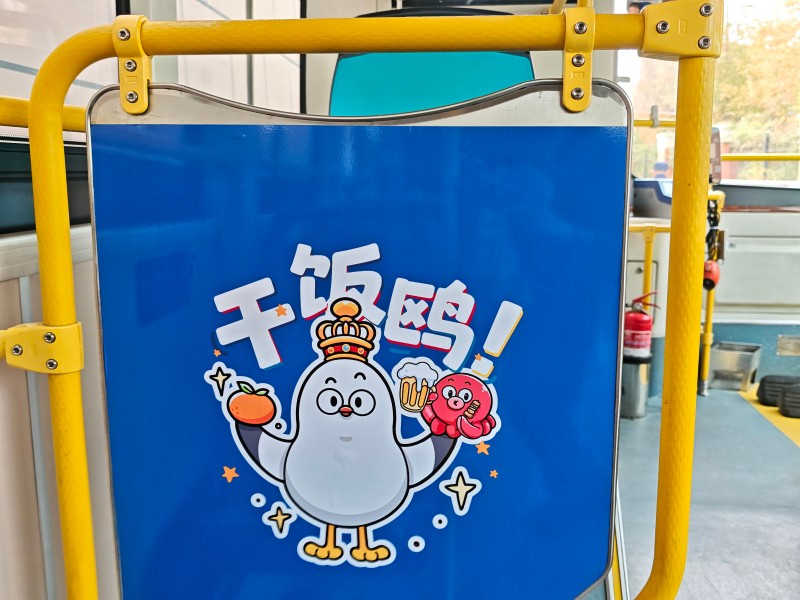 走进车厢,更是惊喜连连。车厢内“快乐鸥”“躺平鸥”“干饭鸥”等海鸥元素随处可见,陪伴着公交乘客出行。