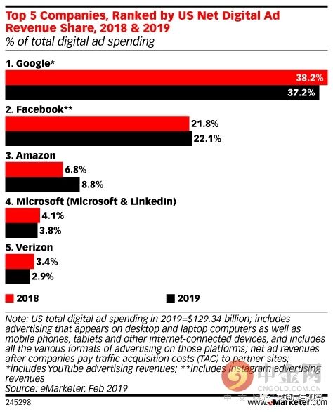 数字广告五大巨头分别是谷歌、 Facebook、亚马逊、微软(及领英)和Verizon。尽管谷歌和Facebook垄断了美国将近六成的数字广告市场,eMarketer认为,这两大数字广告巨头的份额会在2019年有所下滑。